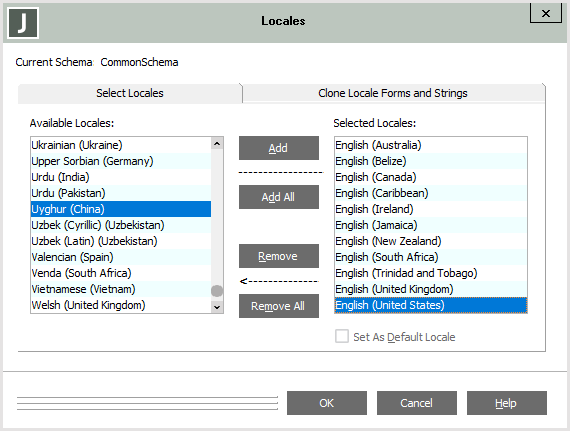 Locales command from the Schema menu to specify the locales that are to be supported by a schema.