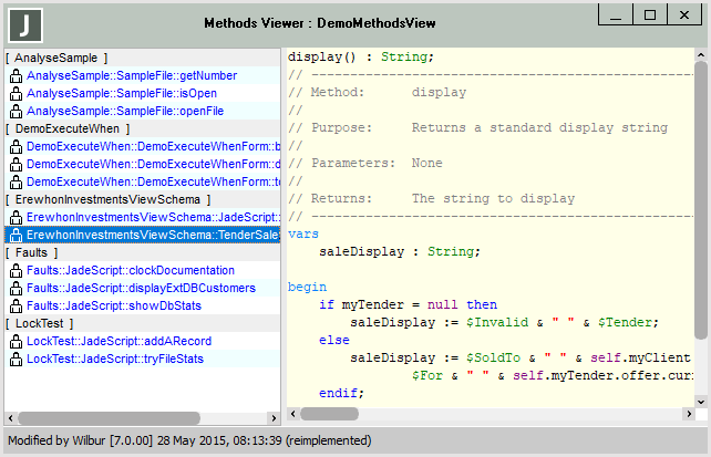 For details about maintaining methods, see "Defining and Compiling Jade Methods and Conditions", in Chapter 4. See also "Locating Text on Which the Caret is Positioned" and "Searching for an Element in all Classes in the Current Schema", in Chapter 3.