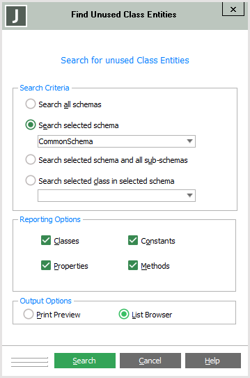 Select the Search selected class in selected schema option button and in the combo box below the option button, select the class of the schema selected in the first combo box or that has a local copy class that will be scanned for unused entities.