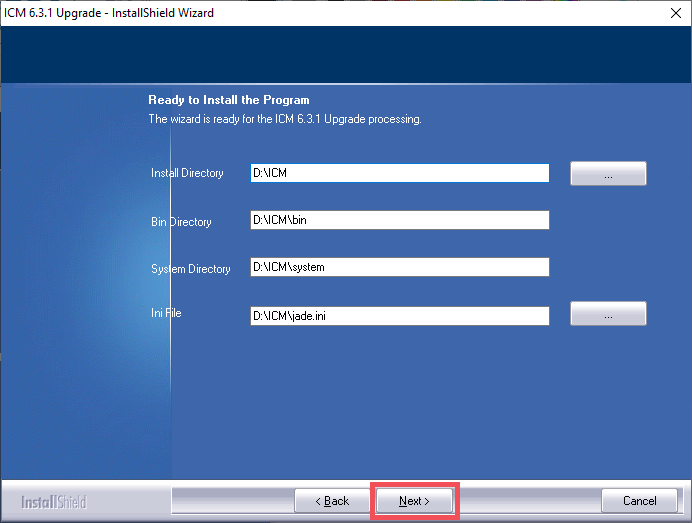 The InstallShield Wizard should now automatically populate the directory fields and the location of the INI file.