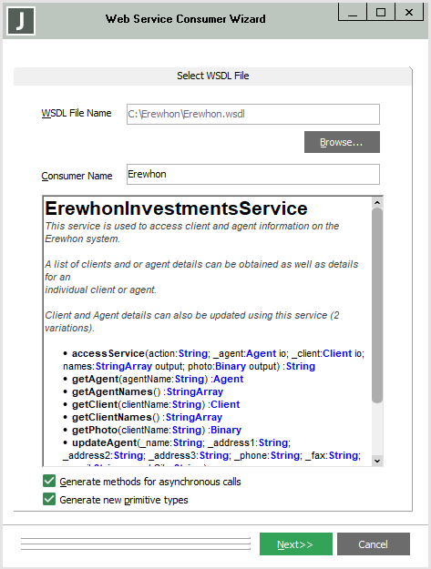 WSDL file details are then displayed in the text box below the Consumer Name text box. The Next button is enabled when a valid WSDL file is detected.