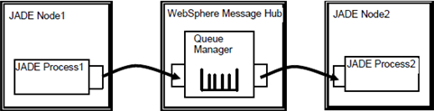 The following diagram, which is only one possible scenario, shows JADE processes in different nodes accessing a WebSphere MQ queue.