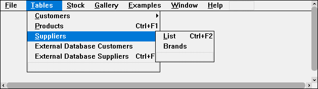 In the following example, the Suppliers command has had a submenu created for it, with two menu items: List and Brands.