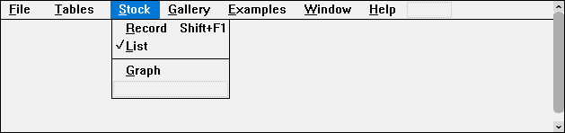 Other features of the Menu Design command are shown in the following image. Under the Stock menu, a Shift+F1 shortcut key has been selected for the Record command. On the same submenu, the List command has had the checked property applied and a Separator has been inserted between the List and Graph commands.