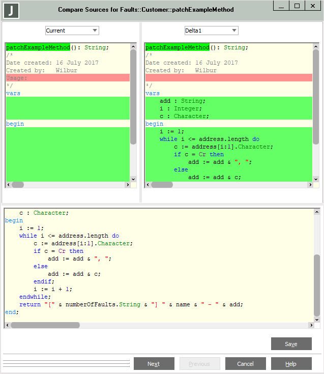 If a method has been checked out to more than one delta, the combo boxes enable you to select the delta in which you want to compare the method source.