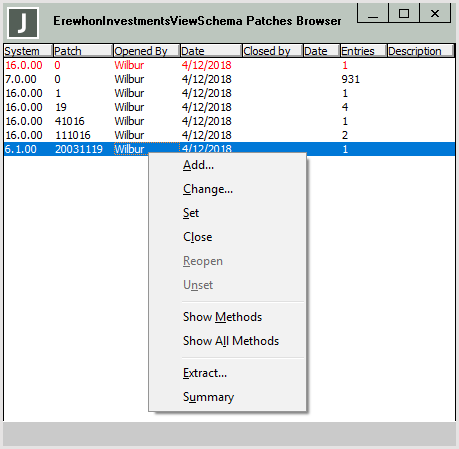 Use the Patches Browser to maintain patches and extract patches for a specified patch number. The Patches Browser displays a list of patch numbers for the current schema, as follows.