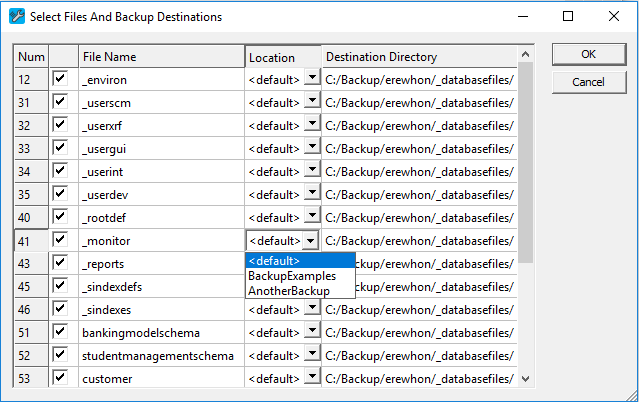 Use this dialog to select (or deselect) individual files for backup and to change the logical location name and destination for each file, if required.