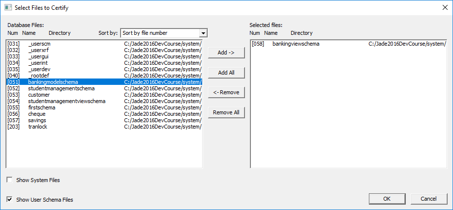 If you want to look for system database files, check the Show System Files check box. (By default, system files are not displayed for selection; that is, user schema files only are displayed when you first access this dialog.)