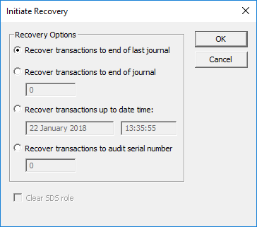 Use the Initiate Recovery command from the Operation menu or click the Initiate Recovery toolbar button, to perform a roll‑forward recovery of previously restored offline backup files to the end of the last transaction, to a specific date and time, or to a specific audit record.