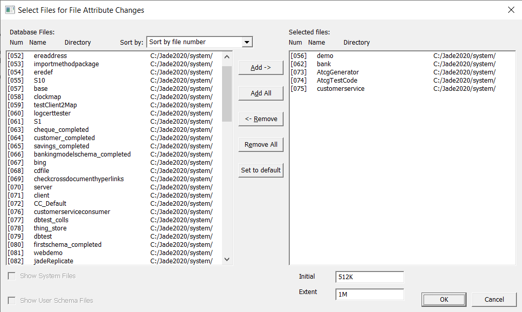 5. Click the Set to default button, to restore the initial size and the growth extent increment size for all files displayed in the Selected files list box to the default values specified by the DefFileGrowthIncrement and DefInitialFileSize parameters in the [PersistentDb] section of the Jade initialization file.