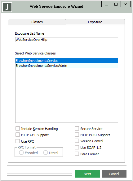 The Classes sheet of the Web Service Exposure wizard, shown in the following image, is then displayed.