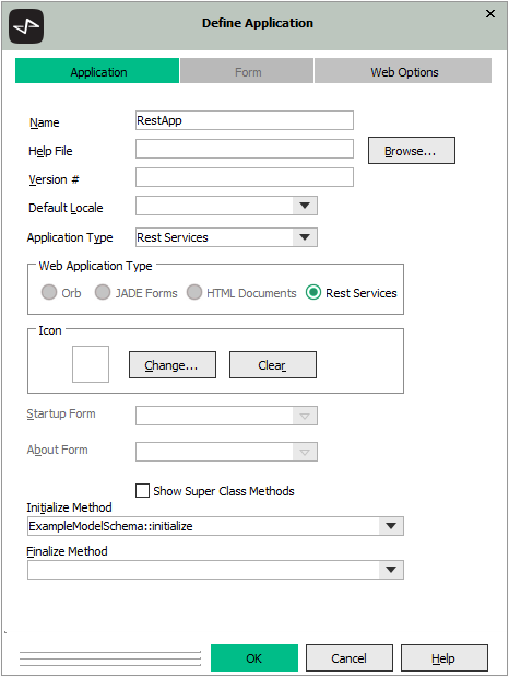 The REST service application is defined from the Define Application dialog in the standard way. For more details, see "