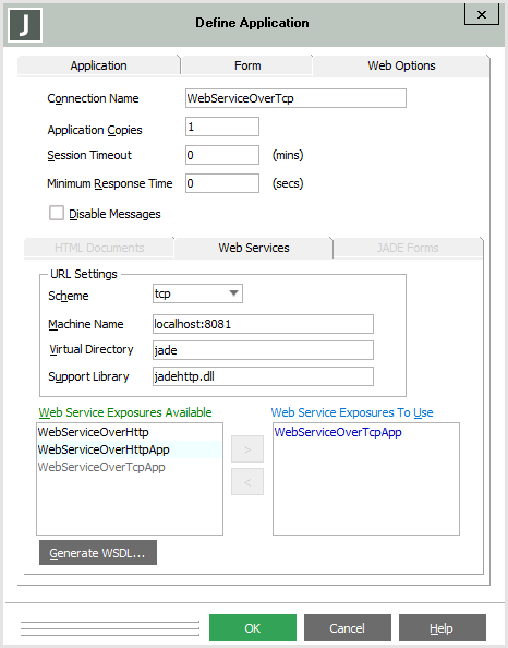 You can enable your Jade application for web services when you first define your application or you can access the Define Application dialog at any time to enable web service access or to maintain your application preferences.