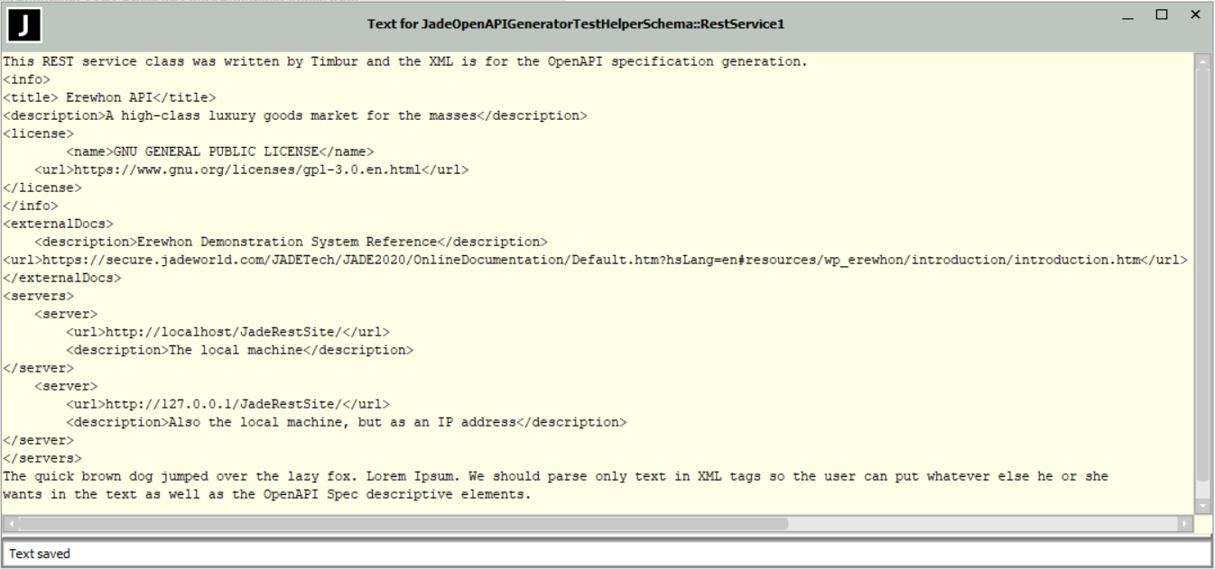 For this documentation text, the text that is not marked up at the beginning and end is ignored, but the text inside the tags provides the default values for the API Description and Servers sheets of the OpenAPI Generation Wizard.