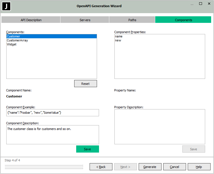 The fourth sheet of the OpenAPI Generation Wizard is the Components sheet, shown in the following image, which enables you to specify an example and description for each component, as well as a description for each property of each component.