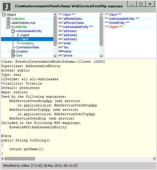 The hierarchical view of your web service exposure is then displayed in a browser similar to the Class Browser, as shown in the following image, which is an example of the initial form of the browser.