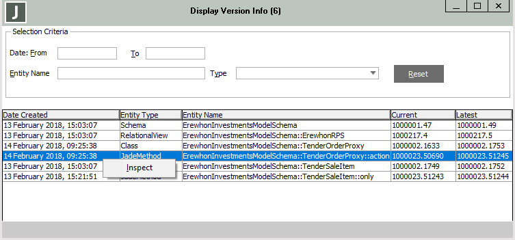 3. In the Entity Name text box of the Selection Criteria group box, specify the name of a specific entity if you want to display schema version changes to that entity only; for example, the TestSchema::JadeScript::test1 method. If you do not enter a value in this text box, all entities that match your other selection criteria are displayed.