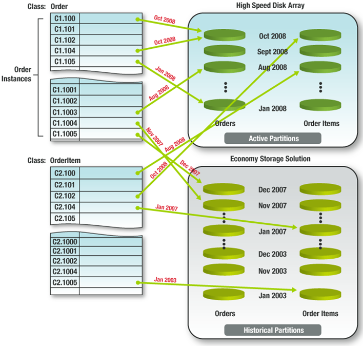 The following diagram shows a partitioning scheme where Order and OrderItem objects are now spread across a number of file partitions where the actual partition is determined by a date attribute. In this image, the flat disks or platters represent file partitions. Each partition stores the Order and OrderItem objects for a specific monthly period.