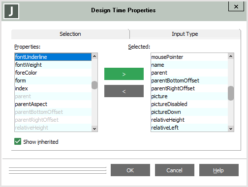 The Selection sheet of the Design Time Properties dialog is displayed when you click the Design Time Properties button in the Options sheet of the Define Class dialog, to enable you to select the properties that are listed in the Properties dialog during your Painter sessions. For example, if you want the design time properties for your control to differ from those of the parent class, use this dialog to specify the design time properties relevant to your new control.