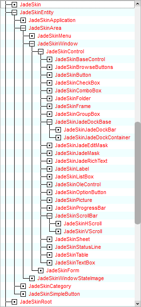 With the exception of the JadeSkin class that is to be deimplemented in a later release, the Jade skin classes provided by the Jade RootSchema have the following hierarchy.