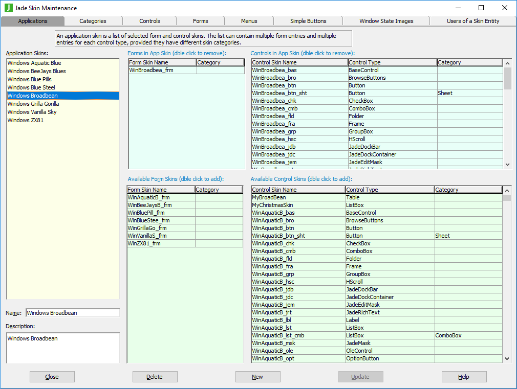 The following image shows the Jade Skin Maintenance dialog after the loading the Windows Broadbean skin.
