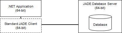 The .NET application connects to the Jade database using the binary files from a standard Jade client, which must be a 64‑bit client.