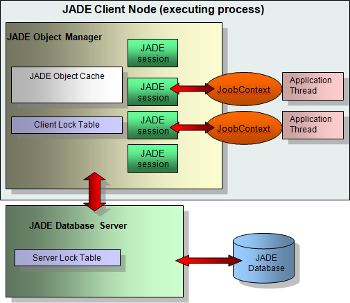 For the purposes of this chapter, a Jade system consists of a Jade database, a Jade database server, and one or more Jade client nodes. Each client node is an executing process containing a pool of Jade sessions that allow threads to connect to Jade using JoobContext instances. There is also a cache to hold local copies of Jade objects accessed by Jade sessions on that client node, and a lock table to record which objects are currently locked by active sessions on that node.