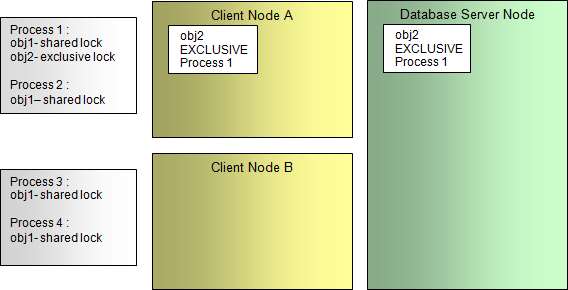 The following diagram shows an example of locks held when requesting locks on frozen objects obj1 and obj2.