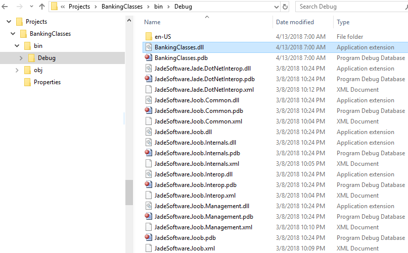 The BankingClasses.dll library is created in the bin\Debug directory of the project. The DLLs from the Jade .NET framework are copied into the same location.
