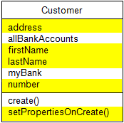The myBank reference is not exposed because it refers to the root object, which is the same for all Customer objects and therefore not semantically important. The myBank reference can be regarded as part of the Jade implementation in that when it is set, a Customer object is added to the root object's allCustomers collection through the automatic inverse reference maintenance that is triggered. The setting of the myBank reference is encapsulated in the setPropertiesOnCreate method.