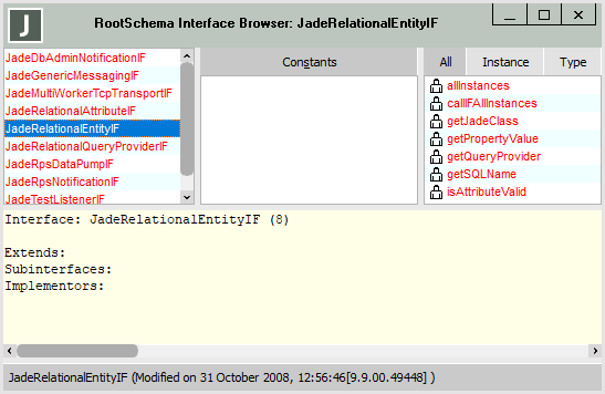 You can view the JadeRelationalEntityIF interface and its methods only in the Interface Browser of a user schema that has an implementation mapping to this RootSchema interface, as shown in the following image.