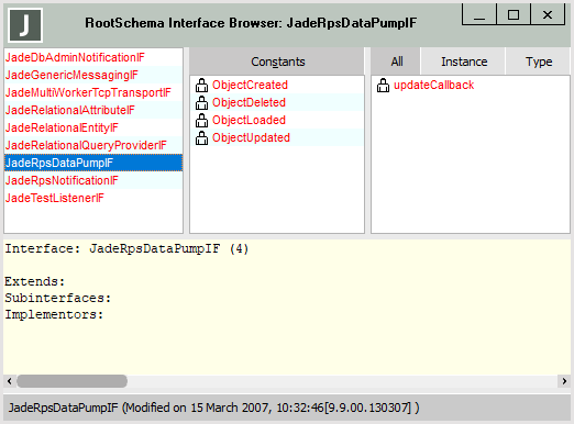 You can view the JadeRpsDataPumpIF interface and its constants and method in the Interface Browser of the RootSchema, as shown in the following image.
