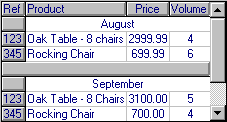 In this example, the table holds entries divided into months, with the month heading centered across three cells and an extended fixed-column cell further dividing each month.