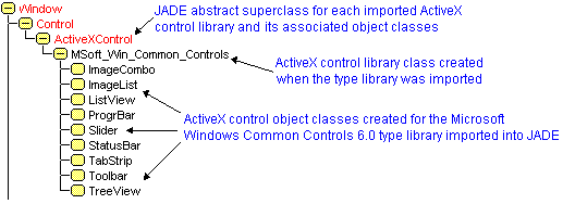 When you import an ActiveX control library into Jade, an abstract class of the specified library name is created as a subclass of the ActiveXControl class. This abstract class becomes the superclass for all classes that are subsequently generated corresponding to objects in the imported ActiveX control library. This ActiveX control library class is the superclass that supports the control object classes within that library, which have properties, methods, and events created that correspond to the default interfaces.