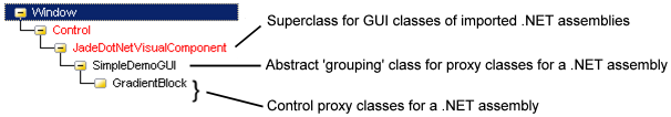 When you import a .NET assembly that contains controls into Jade, an abstract class of the specified assembly name is created as a subclass of the JadeDotNetVisualComponent class. This abstract class becomes the superclass for all of the control classes that are subsequently generated, corresponding to controls in the imported .NET assembly, as shown in the following image.