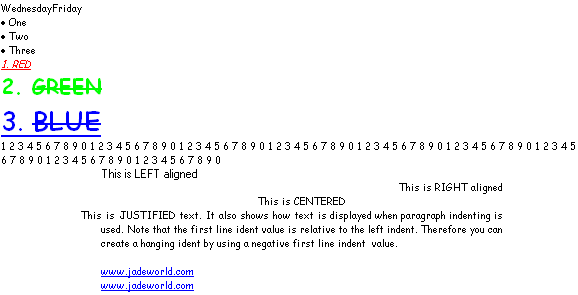 The following image shows the result of this method in a JadeRichText control on a form when the btnRTFByLogic button is clicked.