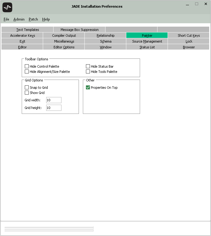 As painter values apply to the whole of the Jade Platform development environment, the Painter sheet is available only on the administrative Jade Installation Preferences dialog.