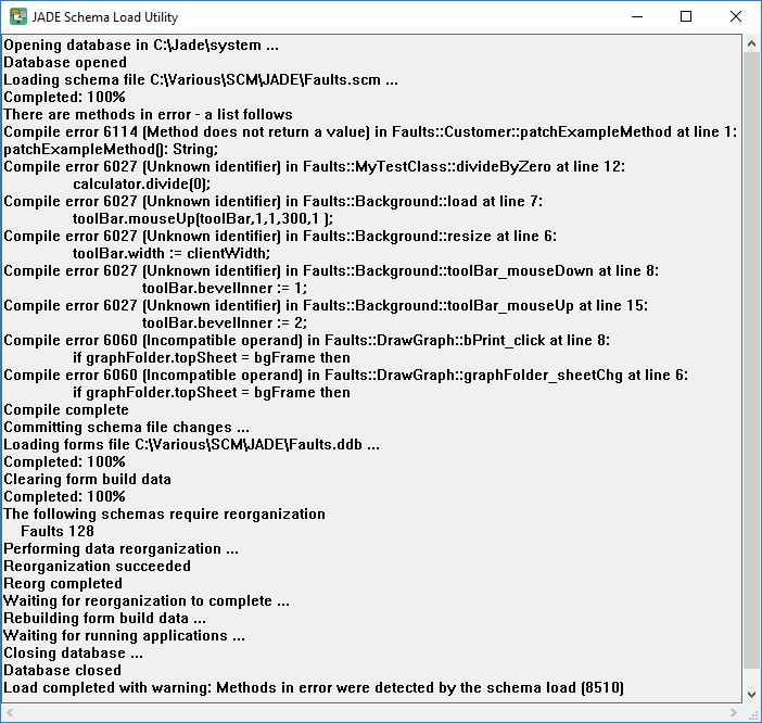 If a schema load is attempted when a reorganization is in progress (regardless of whether the reorganization progress dialog is displayed), the load fails. For details about reorganizing schemas, see "Reorganizing Your Schema", in Chapter 3 of the Development Environment User's Guide.