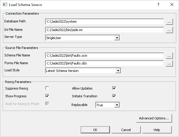 The Load Schema Source dialog, shown in the following image, is then displayed in the Jade Schema Load Utility window. The Advanced Load Options dialog is displayed when you click the Advanced Options button. For details about specifying additional values, see "Specifying Additional Load Options", later in this document.