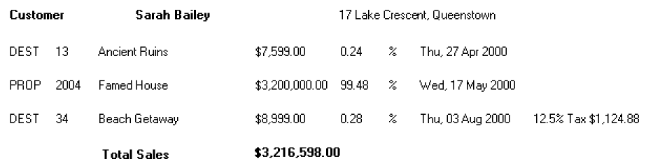 In the following example, it is supposed that a tax was applied to all sales items during the second half of the year, but for some reason it was never applied to destination vacation sales items. For each of these sales items, the 12.5% tax component that should have been applied is printed on the end of the detail line of the sales report.