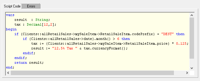 As there can be only one result from a script and the message "Add 12.5% Tax" and the tax amount are different types (string and decimal), the tax amount must be converted to a string so that it can be incorporated into the result. This is very easily done, and demonstrates the use of the methods that are provided on the Add Script Field dialog.