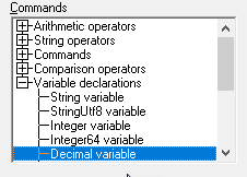 2. Open the Variable declarations folder in the Commands list box and then double‑click the Decimal variable command, as shown in the following image.