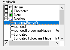 5. Open the Decimal folder in the Methods list box and select the currencyFormat method.