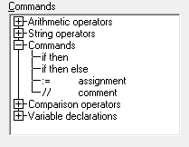 Commands enable you to code simple statements in your scripts. The commands are displayed when you open the Commands folder in the Commands list box of the Add Script Field or Update Script Field dialogs, as shown in the following image.