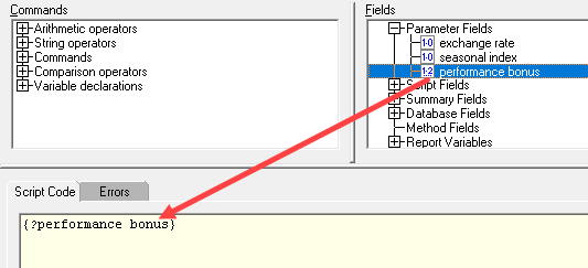 The following image shows the Parameter Fields category expanded to show the fields that have been included in the report example used elsewhere in this guide. The exchangeRate parameter has been selected and is subsequently displayed in the Script Code sheet.