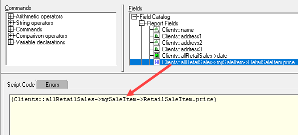 The following image shows the Report Fields category expanded to show the fields that have been included in the report example used in this guide. The sales price has been selected and is subsequently displayed in the Script Code sheet.