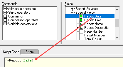 The following image shows the Special Fields category expanded to show the special fields used in your report. The Report Date special field has been selected and is subsequently displayed on the Script Code sheet.