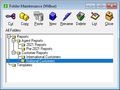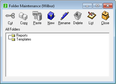 Two parent folders are provided, by default. These folders, named Reports and Templates, are designed to enable you to store reports and templates in separate locations. However, you can rename these folders to support your own naming or filing convention, if required. For details, see "Using the Folder Edit Commands", later in this chapter.