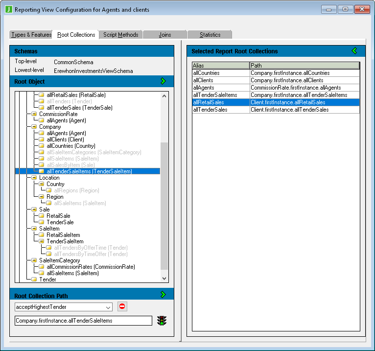 A collection is a basic structure used to store multiple object references or primitive values. In the Jade Report Writer, a root collection is a collection (or group) of similar objects. A root collection path is a navigable path by which a root collection is accessed. A root collection path is defined by all instances of a class (for example, Client.instances) or by following an object reference to a Jade collection (for example, Company.firstInstance.allAgents).