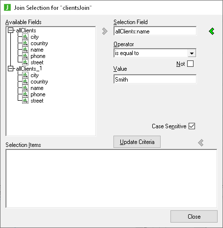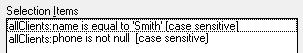 If you then check the Not check box for this formula, you effectively refine join criteria to those clients named Smith, but only those who have an email address. The following image shows the Selection Items list box as it is displayed with these selection criteria applied.